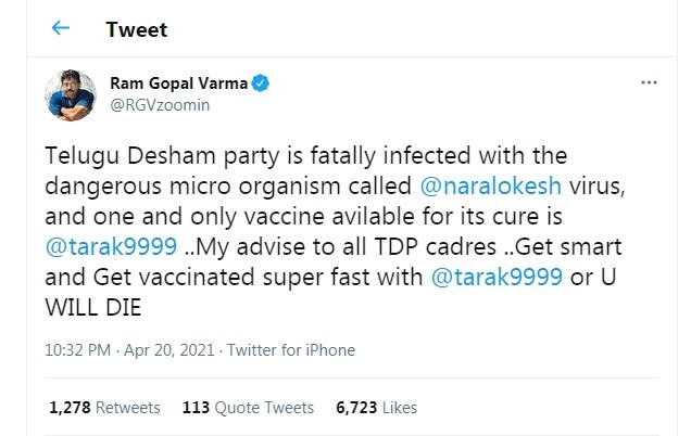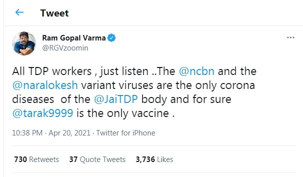 సందర్భం వచ్చిన ప్రతిసారి టీడీపీ నేతలపై కామెంట్లు, ట్వీట్లు చేసే రామ్ గోపాల్ వర్మ. తాజాగా లోకేష్ పై వరుస ట్వీట్ల వాన కురిపించారు. ట్వీట్ లో చెప్పాలి అంటే టీడీపీకి నారా లోకేష్ అనే ప్రమాదకరమైన వైరస్ పట్టుకుందన్నారు వర్మ. అది కూడా చాలా ప్రాణాంతకమైందన్నారు. ఆ వైరస్ ను అలానే వదిలేస్తే టీడీపీ నేతలు, కార్యకర్తలకు అందరికీ ప్రమాదం అన్నారు. అయితే ఆ ప్రమాదకరమైన వైరస్ కు విరుగుడు కూడా ఉందన్నారు. ఆ విరుగుడుకు ఏకైక వ్యాక్సిన్ తారక్ అంటూ సలహా ఇచ్చారు రామ్ గోపాల్ వర్మ.