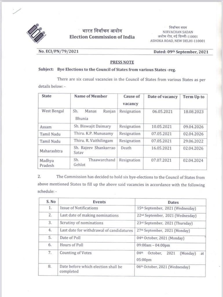 రాజ్యసభ ఉప ఎన్నికలకు కేంద్ర ఎన్నికల సంఘం జారీ చేసిన షెడ్యూల్
